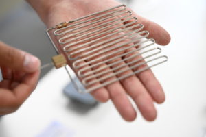 細かく曲げられた細いパイプに水を通すことで、熱を冷却するための部品です。ステンレスと真鍮という異なる材質の小さなパーツが、銀ロウ付けで接合されています。