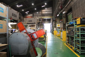 木原氏:当社の営業品目の大半は金属プレス加工品です。その中でも、絞り加工(金属の板を金型に押し当てて“円筒状の立体形状”に変形させる加工)、特に、製品の直径以上の深さに絞り加工を行う深絞りプレス加工は、業界内でも技術力と品質の面で高く評価されています。トランスファープレスと呼ばれる、複数の金型を組み合わせて、少しずつ何回かに分けて成形していく工法を採用しています。この深絞りプレスを行える会社は国内で少しずつ減少傾向にあります。